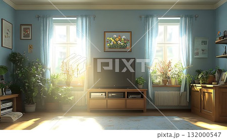 Sunlit living room interior with plants and wooden furniture