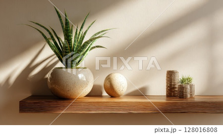 Minimalist Home Decor: Plants and Ceramic Pots on Wooden Shelf