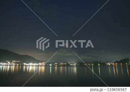 夏の暮れ時の河口湖と雲間から魅せる富士山のシルエット