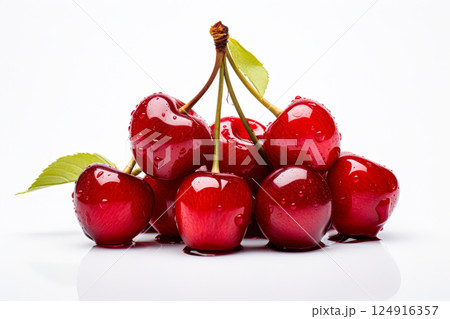 Four red cherries with green leaves on top.