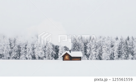 Smoke rising from chimney of a cozy wooden cabin nestled in a snow covered valley, surrounded by a pristine forest of snow laden pine trees, creating a serene winter wonderland scene