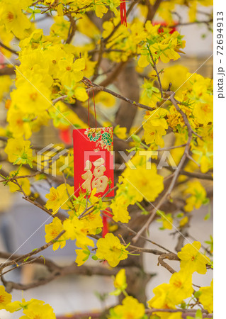 Lucky money and apricot blossom tree in Vietnamese Tet Holiday