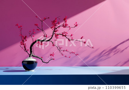 AI-generated content. Red Sakura Tree Branch in blue vase on bright pink background with shadows