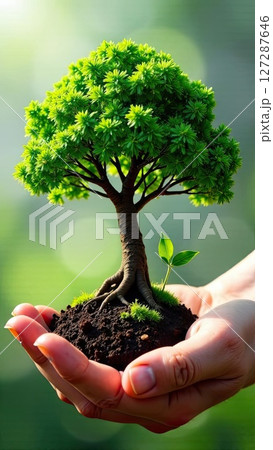 A tiny green tree in handful of earth in hand in the ground close-up. Ecology, care , bonsai. AI generated