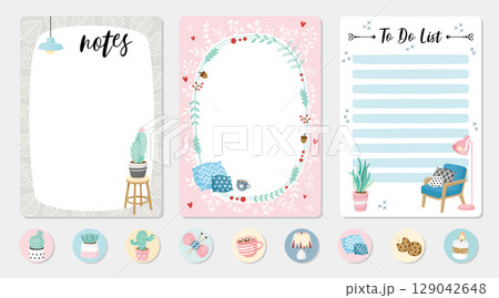 一組可愛手繪平面風格居家室內裝飾物品插圖的筆記本內頁設計圖框向量素材圖片