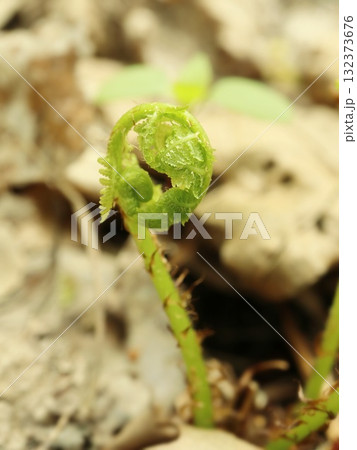 Unfurling Fern Fiddlehead Emerging on Forest Floor in Spring from Brown Leaves