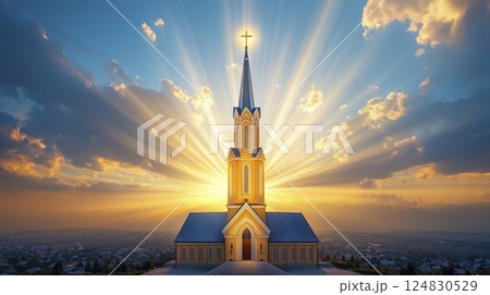 Golden Sunset Illuminates Church Steeple Above Cityscape