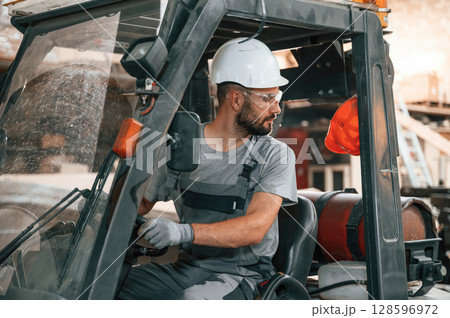 Cute snowman inside a glass ornament among artificial snowdrifts on a blue bokeh background. Christmas background with copy space for greeting cards, banners and holiday promos.