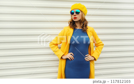 Autumn portrait of beautiful trendy young woman in yellow french beret hat, stylish girl posing