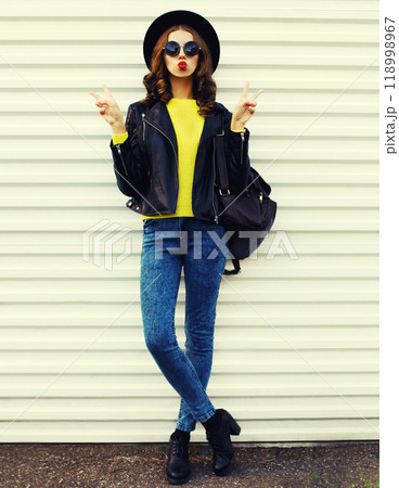 Fashion young woman wearing a black rock jacket, handbag over green leaves texture wall