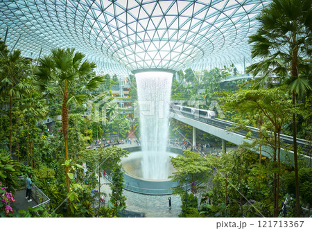 Jewel changi airport futuristic indoor waterfall cascading in lush green tropical forest