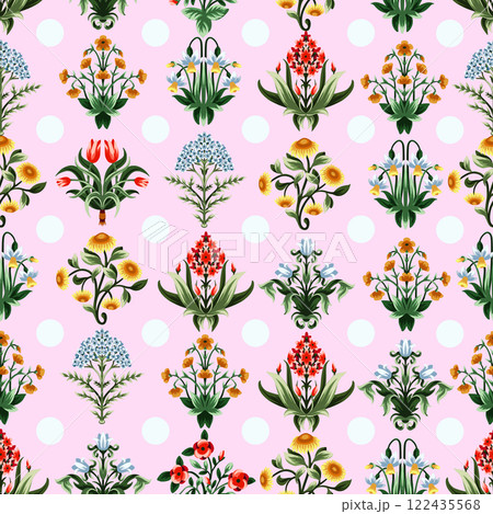 Ditsy seamless pattern with symmetrical flowers. Vector.