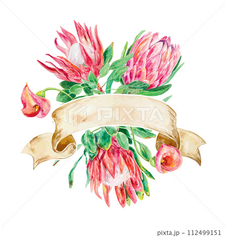 Protea card watercolor, calla lilies, banner for text. Vector illustration of a bouquet of pink flowers. Wedding invitations, banners, covers, labels.