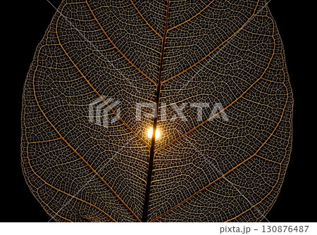 Skeleton leaf with a glowing sun a macro shot of nature's beautiful and intricate patterns