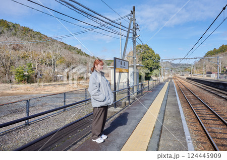 駅のホームで電車を待つ女性 田舎