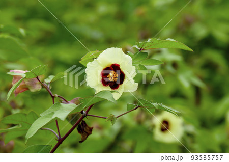 自然 植物 ワタ、鮮やかな黄色の中心にえんじ色を配した和綿の花。観賞用にもなりそうです