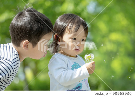 新緑の公園でタンポポの綿帽子を吹いて遊ぶ兄と妹