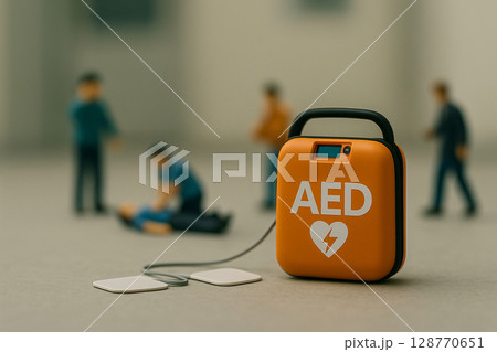 AEDによる心肺蘇生を行う緊急対応のミニチュアシーン(応急処置・救命処置のイメージ)