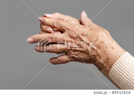 A senior woman massages her fingers, experiencing pain in the joints. Gray background, hands close-up. The concept of rheumatism and arthritis