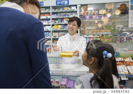 薬局で風邪薬を買う親子