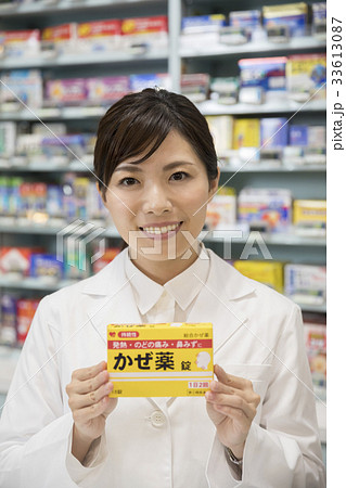 薬局でかぜ薬を見せる薬剤師女性
