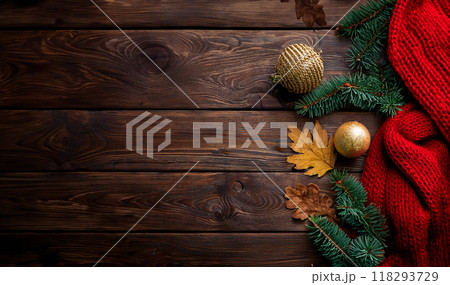冬クリスマスイメージの背景 ニットのマフラーと落ち葉とオーナメントともみの木