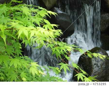 緑のモミジと小さな滝