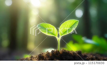 Plants growing from the soil in the forest with a blurred background. Young plant growing in sunlight.