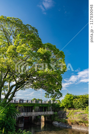 多摩川の二ヶ領上河原堰と三沢川水門 夏晴れの青空 神奈川県川崎市