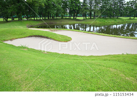 緑濃い初夏のゴルフ場 池 バンカー 人無しグリーン