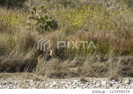 Indian hog deer or Axis porcinus with eye contact in near dry river bed and in natural grass background at dhikala zone of jim corbett national park forest tiger reserve uttar pradesh india asia