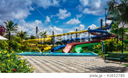 Water slide in an exotic park with palm trees against the blue sky. Outdoor water park