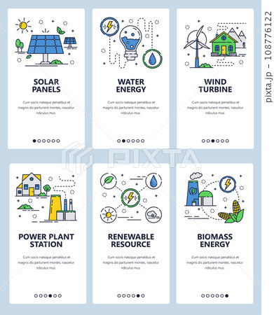 Green energy concept onboarding screens. Alternative energy sources and ecology, solar panels and windmills. UI, UX, GUI user interface kit with flat people scene. Vector illustration for web design