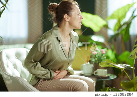 Woman in a mint green sweater showing signs of stomach pain while sitting at home, demonstrating discomfort and need for relief