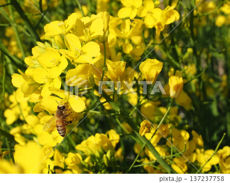 菜の花の花芯にとまろうとするセイヨウミツバチ(アブラナの黄色い花と西洋蜜蜂)