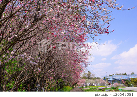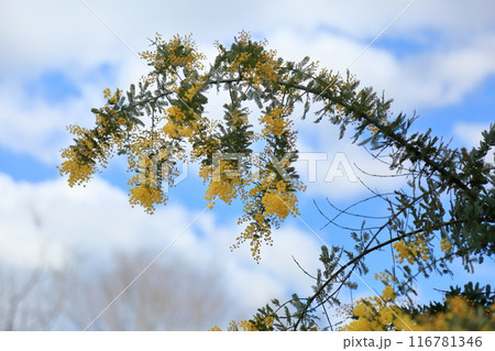 ウコン 黄緑色で珍しい 桜の花 青空背景 クローズアップ