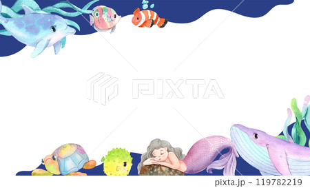 Mermaids and Marine Animals Frame Design, Watercolor Hand-Drawn Illustration