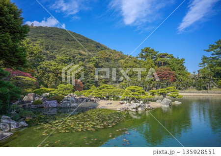 青空と緑豊かな山を背景にした美しい秋の日本庭園の池と松の風景