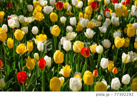 一面に広がる白、黄色、赤のチューリップ 春イメージ