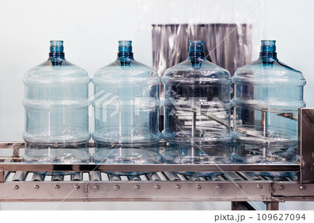 drinking water clean bottles automated move in conveyor rollers for watering bottling in drink water plant factory.