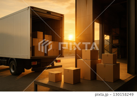 Delivery truck unloading cardboard boxes at warehouse during golden sunset, showcasing logistics and supply chain industry with warm cinematic lighting and organized packaging