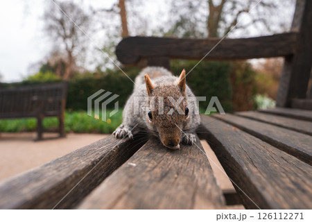 A squirrel sits on a wooden bench in a London park, surrounded by blurred greenery, trees, and another bench in the background.