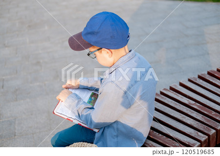 a 10-year-old boy wearing glasses and a cap sits on a bench on the street and reads an interesting book against the sky, copy space