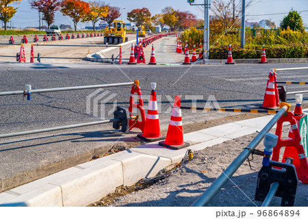 工事中の歩道 縁石の敷設と三角コーンとバリケード 高彩度コントラスト