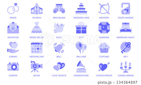 Wedding web icons set in duotone flat design. Pack pictograms with rings, church, brougham, cake, archery, invitation, bride dress, dove, gift, love hearts, marriage night, other. Vector illustration.
