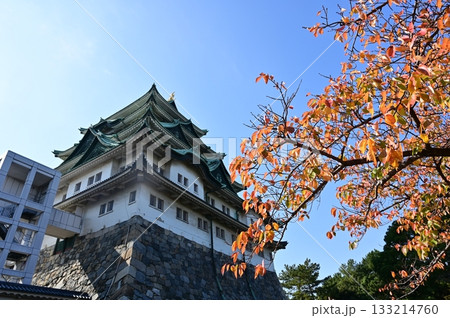 ソメイヨシノの紅葉と天守閣(名古屋城)