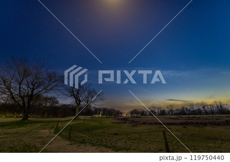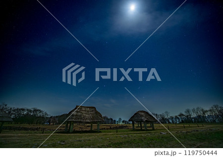 月明りに照らされる縄文世界遺産大湯環状列石と夜空の星