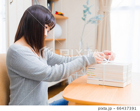 断捨離する女性 古本をまとめる コピースペース