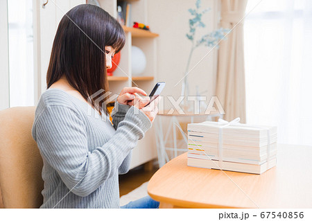 書籍を処分する女性 スマホ 調べる 検索 コピースペース