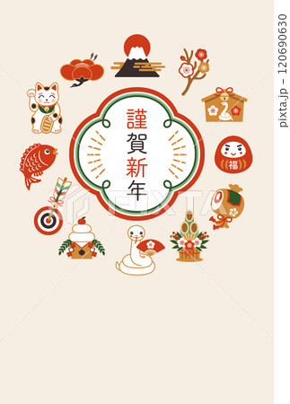 2025年 蛇と縁起物の年賀状テンプレート